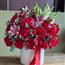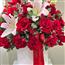 描述: 红玫瑰、百合、桉树叶组成、精美包装。