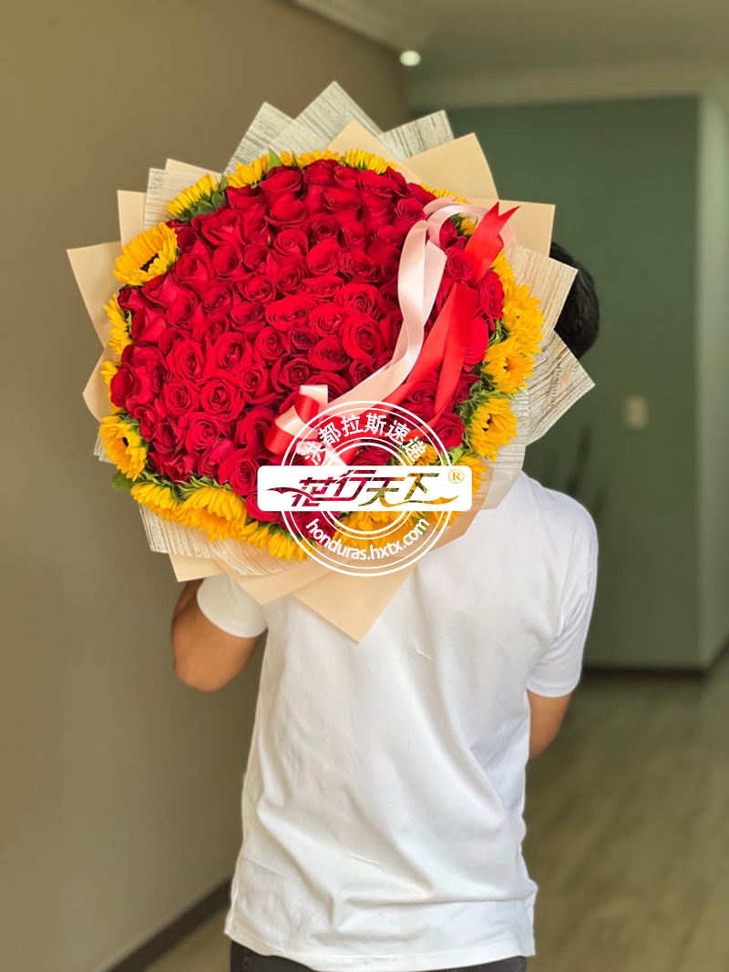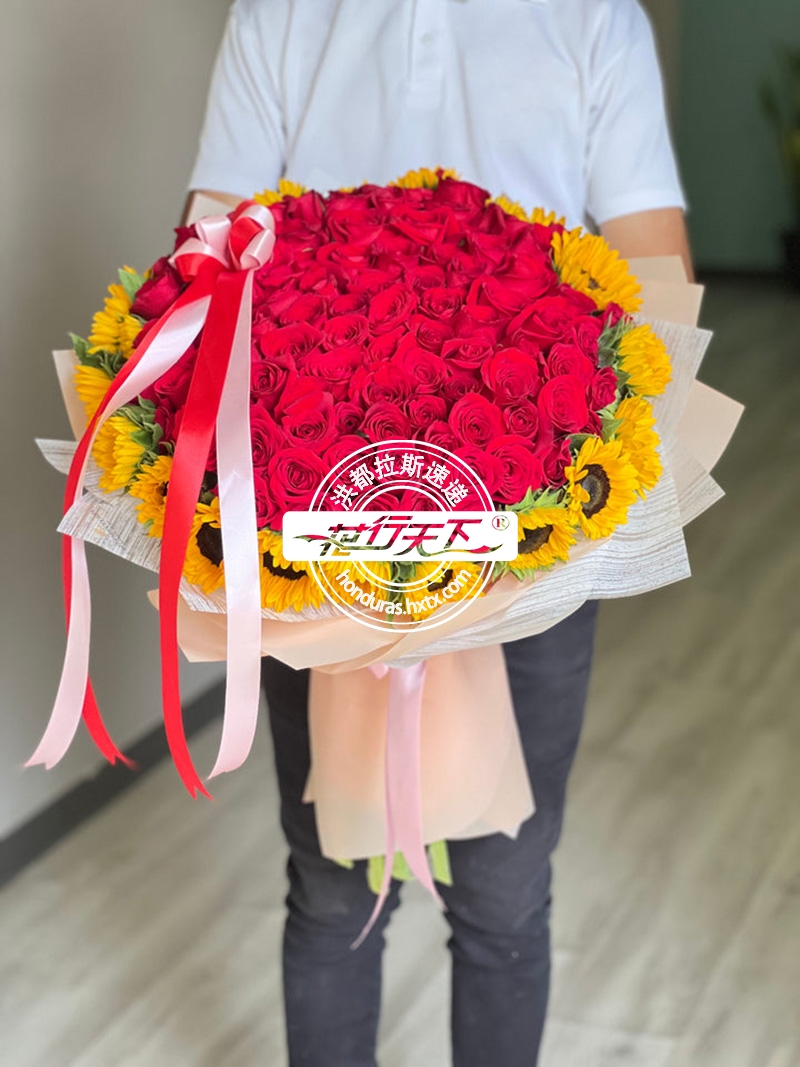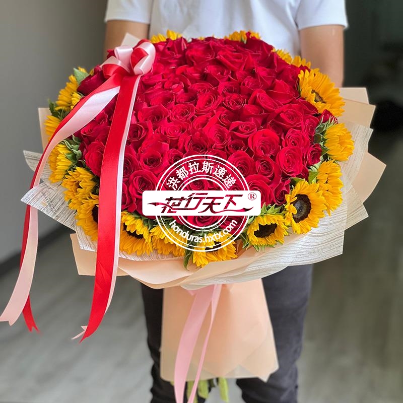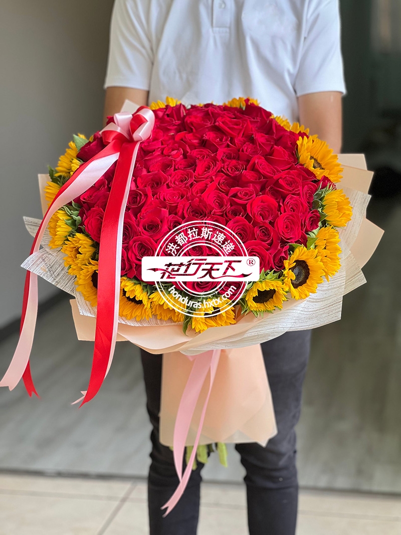 描述: 100朵红玫瑰和向日葵组成、精美包装。