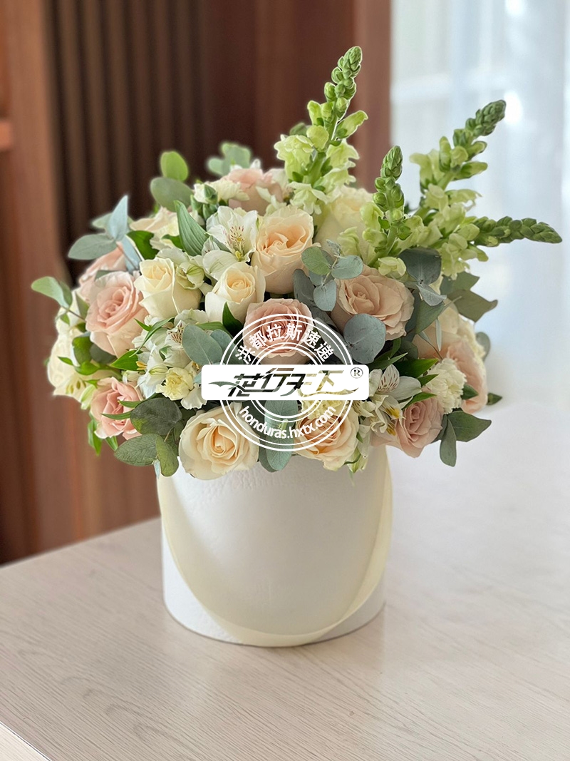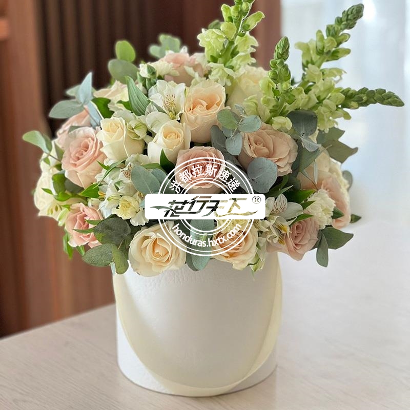 白色和米色玫瑰、白金鱼草、桉树叶组成、精美包装.