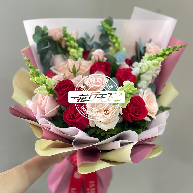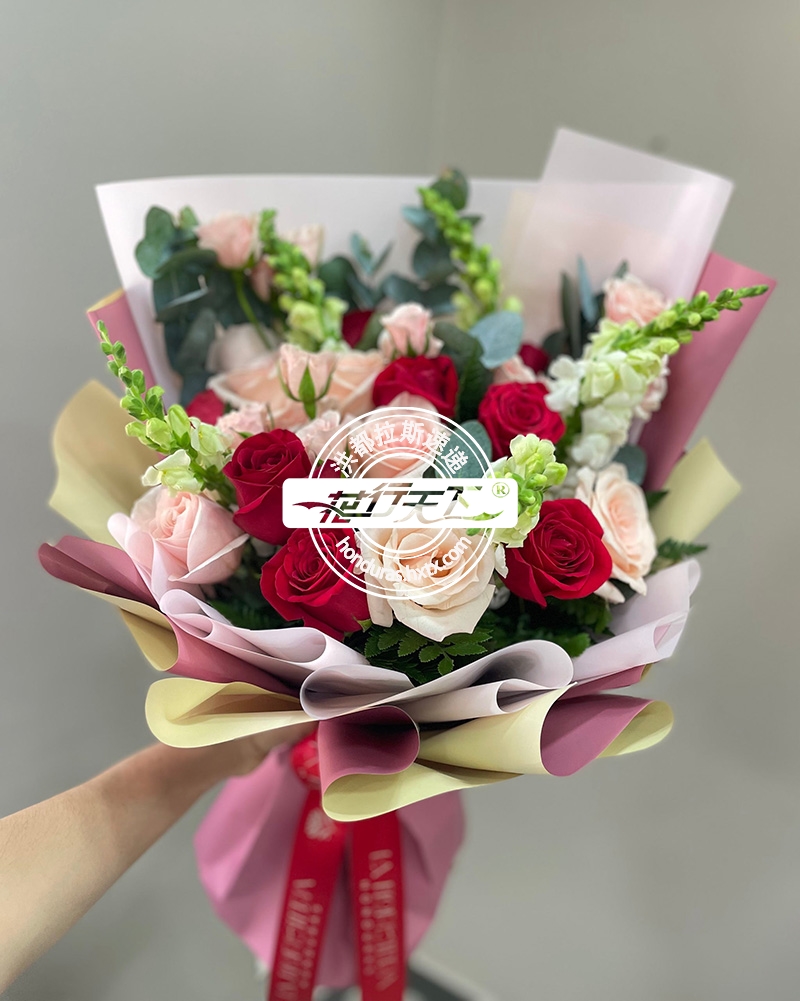 描述: 20朵不颜色玫瑰、金鱼草组成、精美包装。