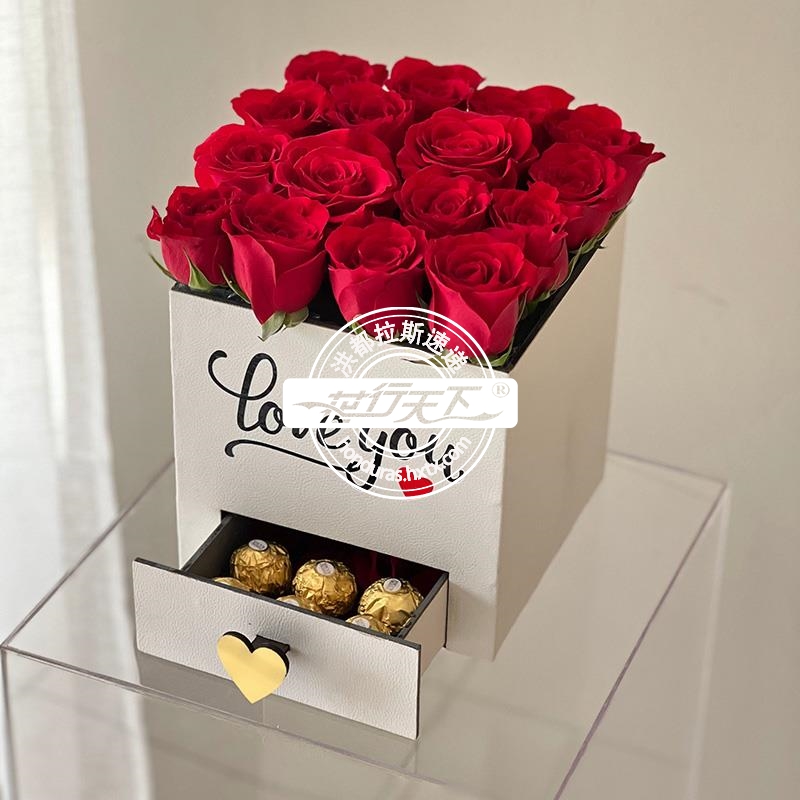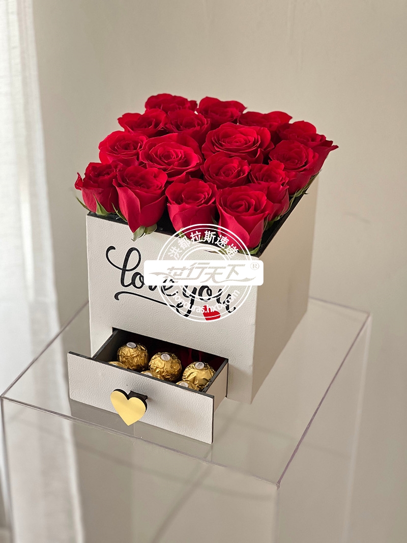 描述: 红玫瑰、费列罗巧克力组成、长型礼盒装。